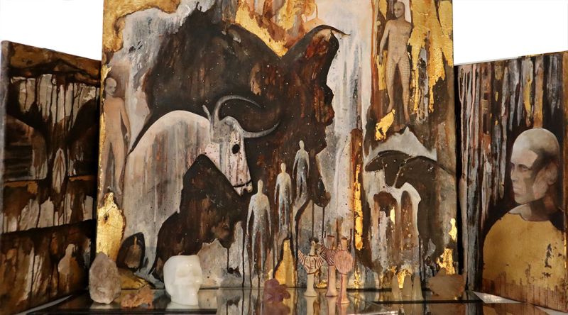 Triptych Oil Painting & Crystals Altar  – Size 150 w x 50 h x 50 d cm
